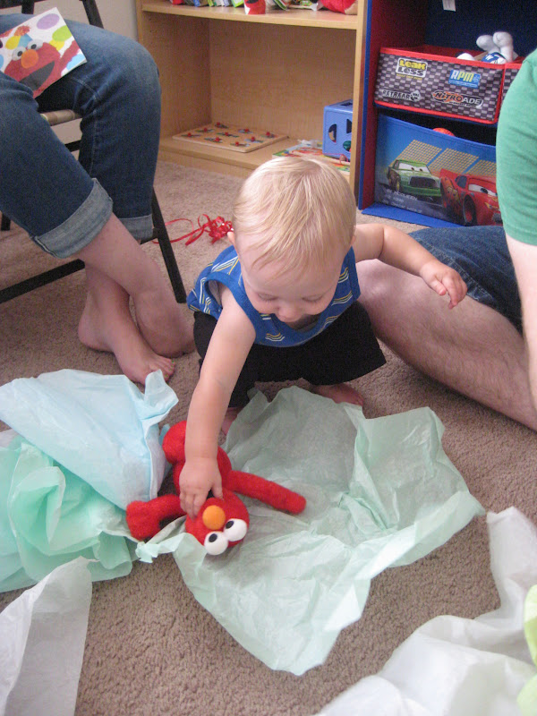 After presents, it was the moment we had all been waiting for: Alexander's first taste of cake! I have to admit that he didn't quite perform the way we thought he would. Maybe he got too full on spaghetti, or maybe that bright colored frosting scared him. Whatever it was, he would NOT eat the cake. He touched it a little here and there, but he wouldn't eat it. So Scott tried to force a little in his mouth, when that didn't work, Amy opened her mouth really wide and made a funny sound and she snuck some in his mouth! After the first taste though, Alexander was hooked and dug in and ate it until it was all gone. At least he enjoyed it once he finally tasted it. Below are his cupcake eating pictures and a few more fun ones: